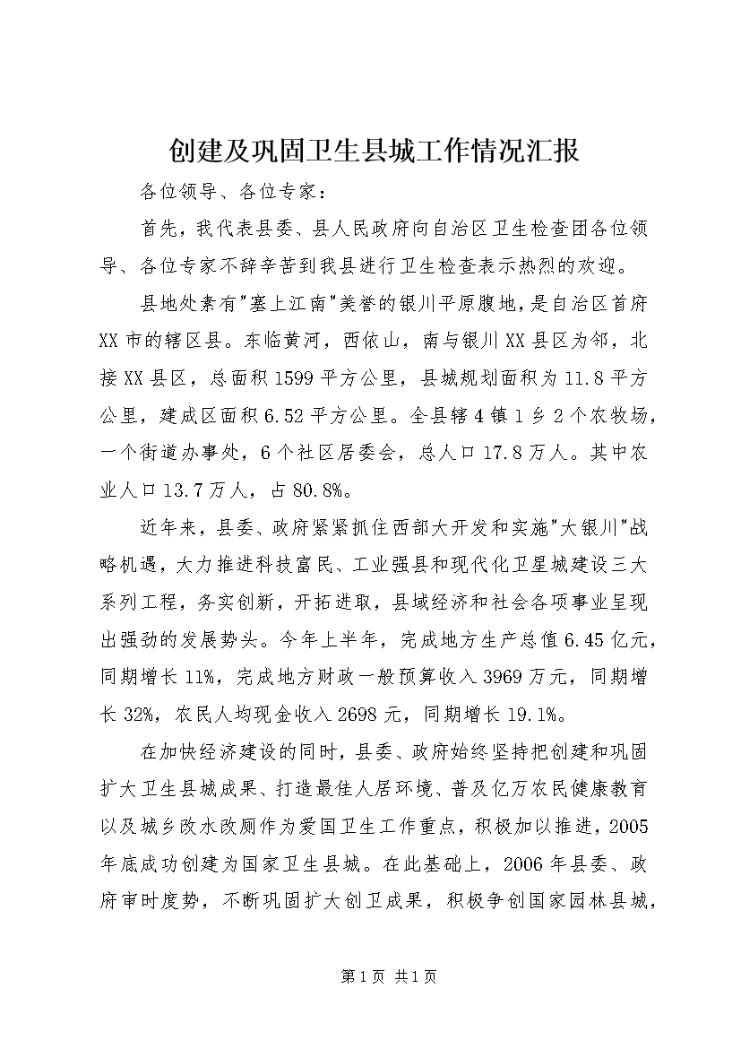 创建及巩固卫生县城工作情况汇报