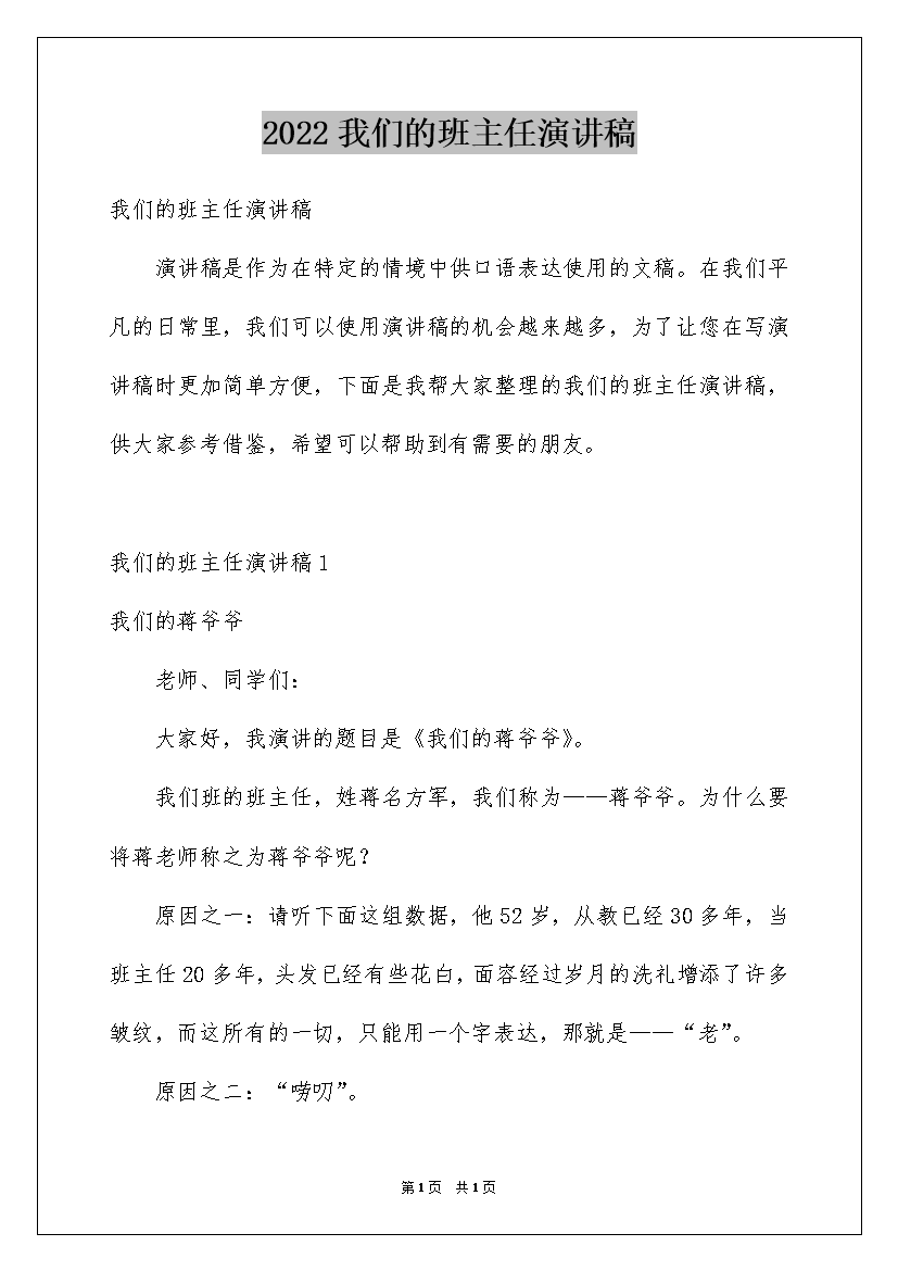 2022我们的班主任演讲稿