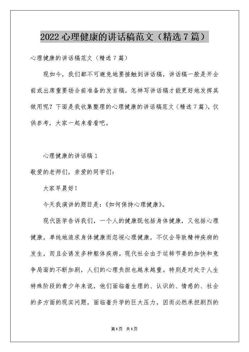 2022心理健康的讲话稿范文(精选7篇)