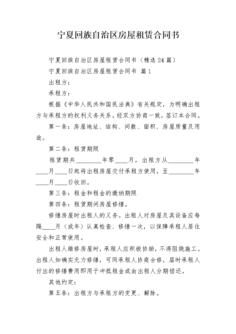 宁夏回族自治区房屋租赁合同书