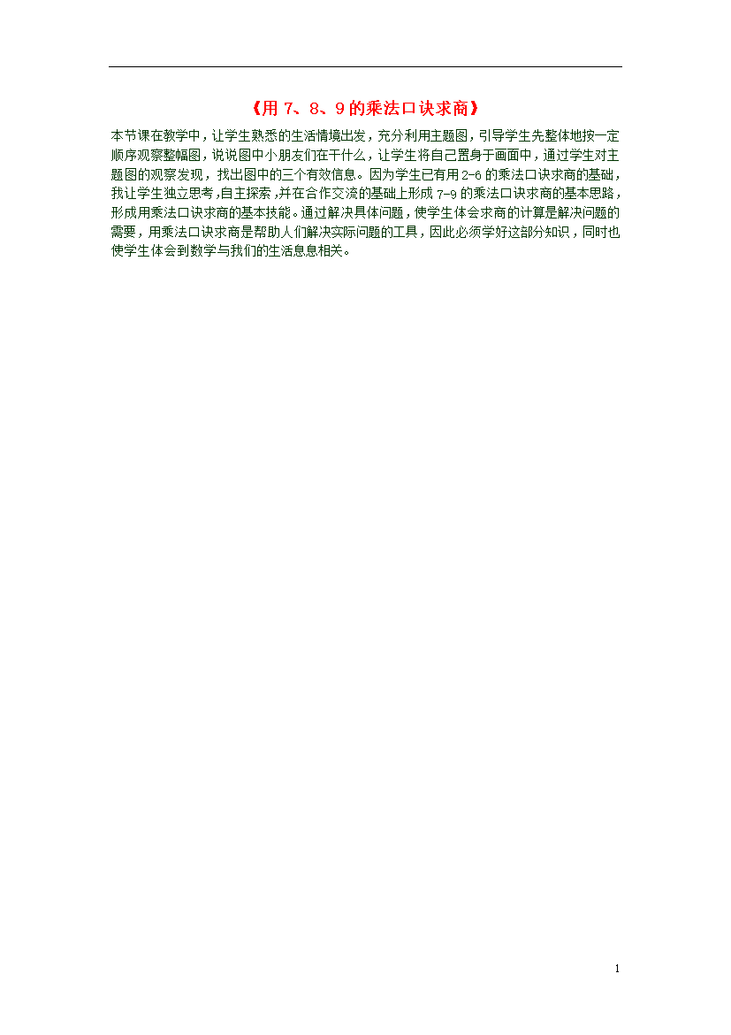 素材-全国-2020_二年级数学下册《用7、8、9的乘法口诀求商》教后反思 新人教版