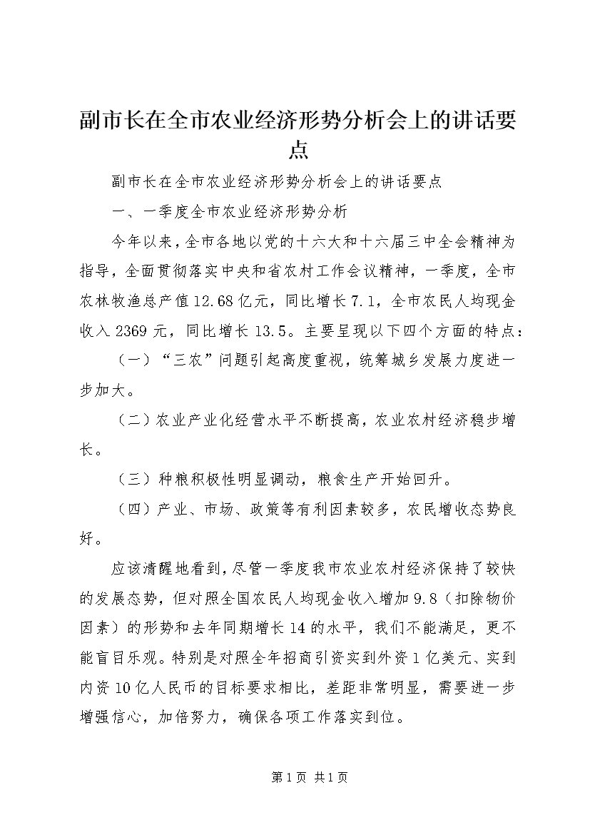 副市长在全市农业经济形势分析会上的讲话要点 (3)