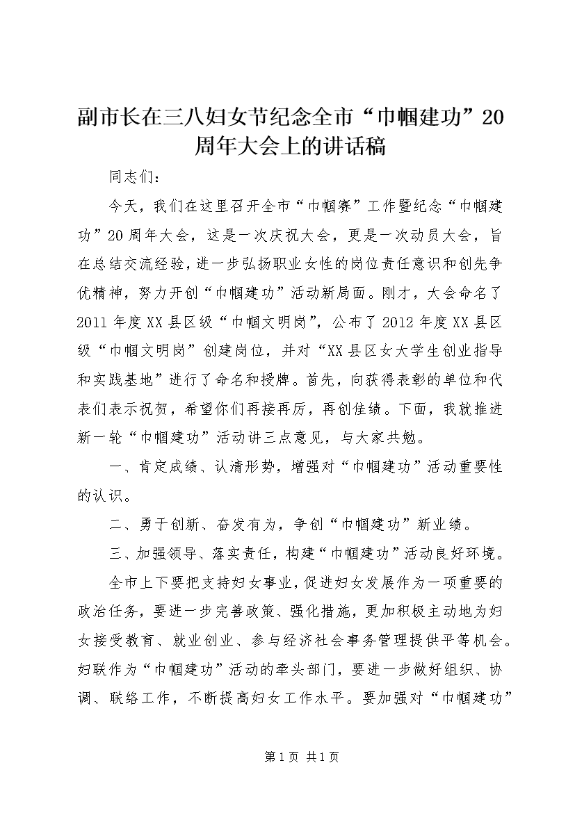 副市长在三八妇女节纪念全市“巾帼建功”20周年大会上的讲话稿