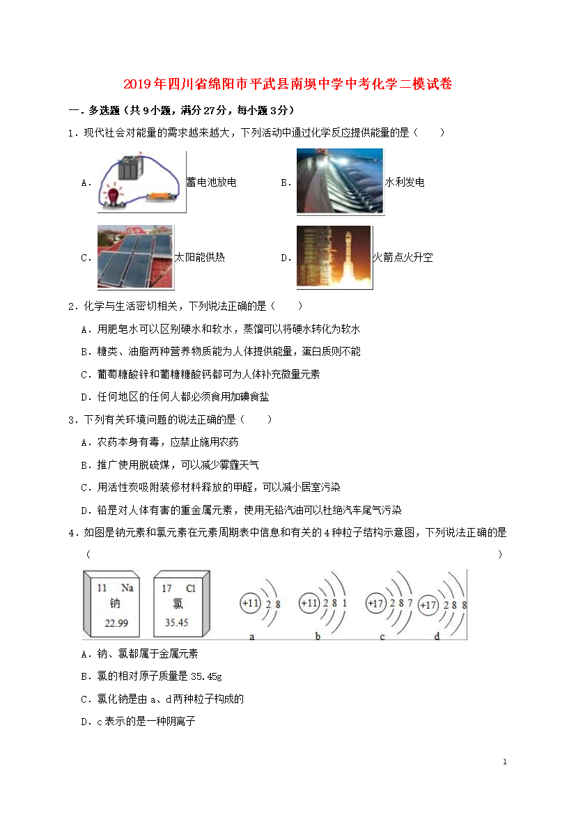 试题-四川-2019_四川省绵阳市平武县南坝中学2019年中考化学二模试卷(含解析)