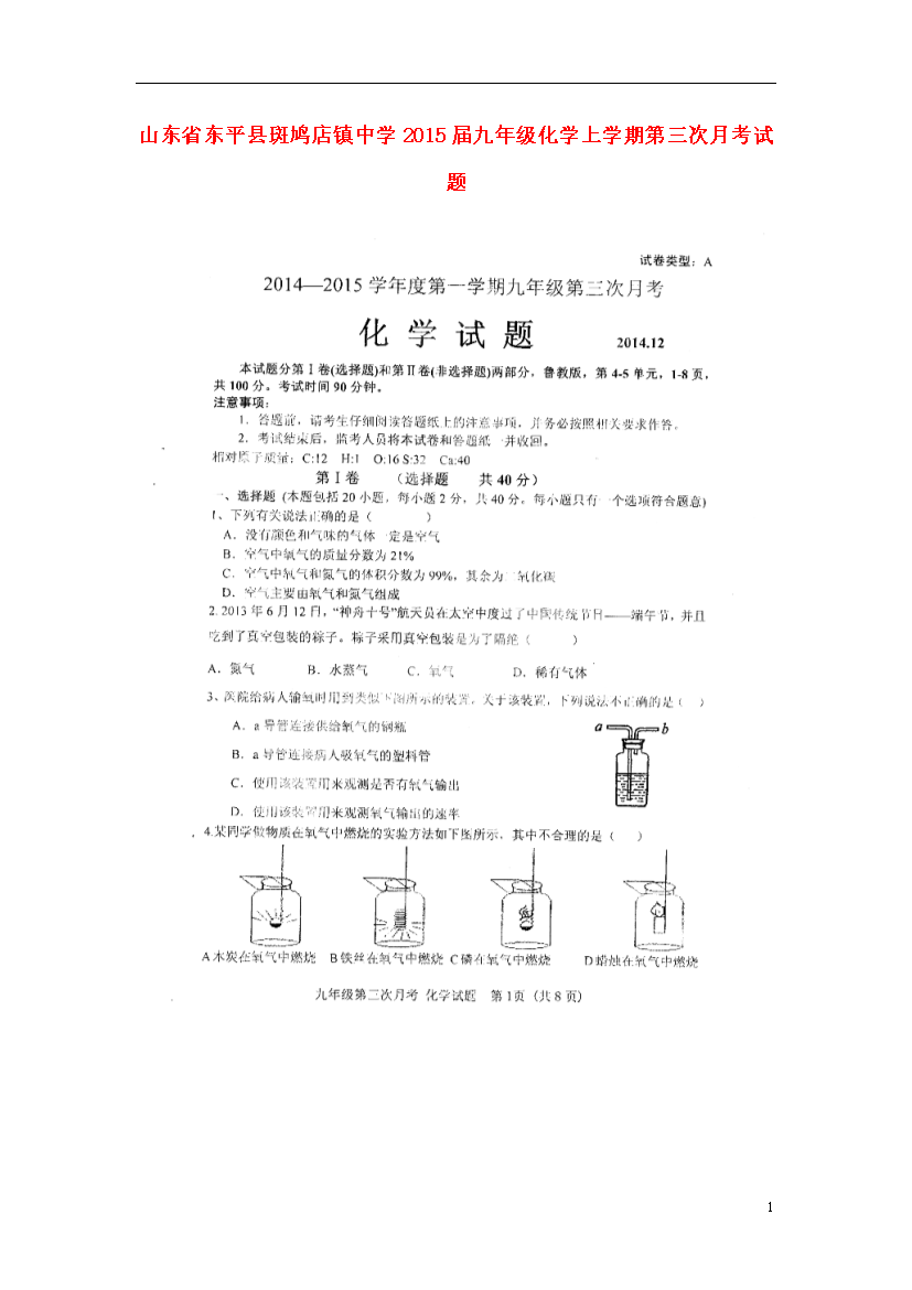 试题-山东-2015_山东省东平县斑鸠店镇中学2015届九年级化学上学期第三次月考试题(扫描版)