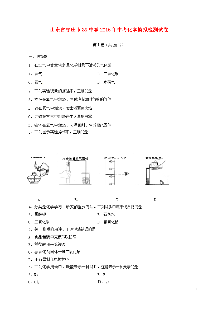 试题-山东-2016_山东省枣庄市39中学2016年九年级化学下学期模拟检测试题(无答案)