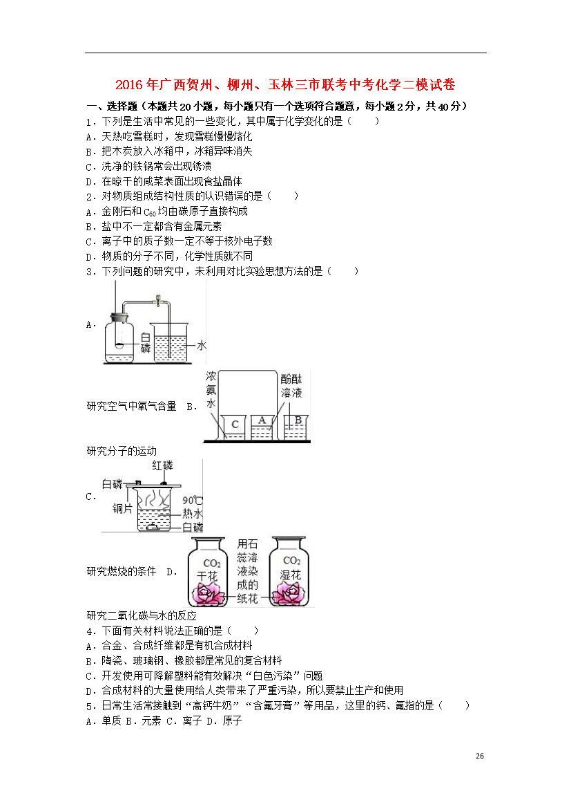 试题-广西-2016_广西来宾市2016届中考化学全真模拟试题(五)(扫描版)