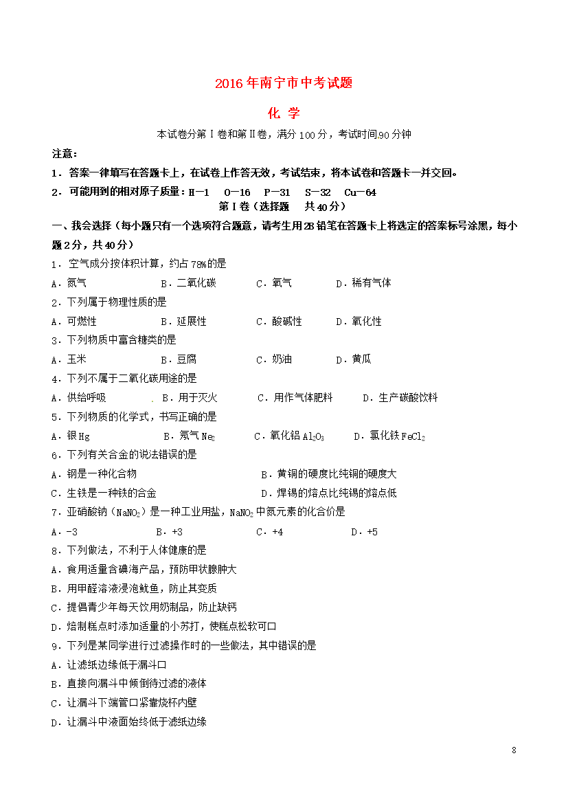 试题-广西-2016_广西南宁市2016年中考化学真题试题(含答案)