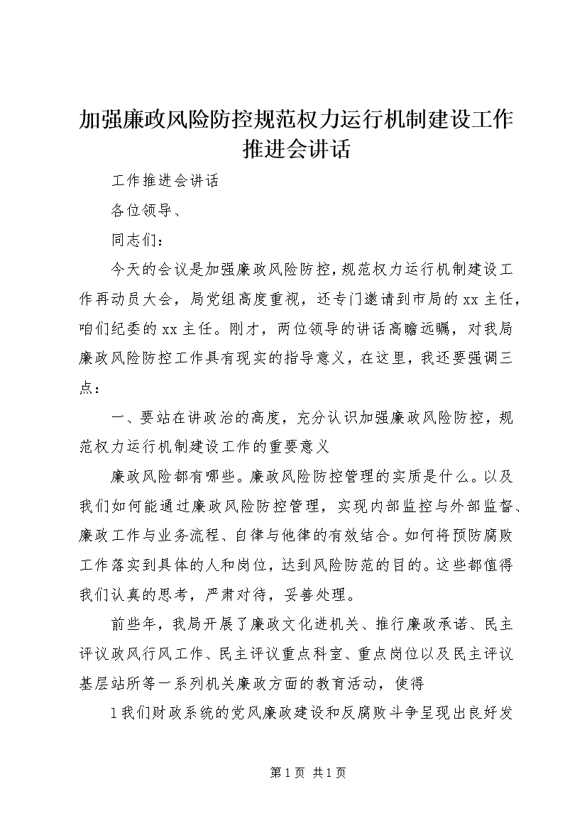 加强廉政风险防控规范权力运行机制建设工作推进会讲话