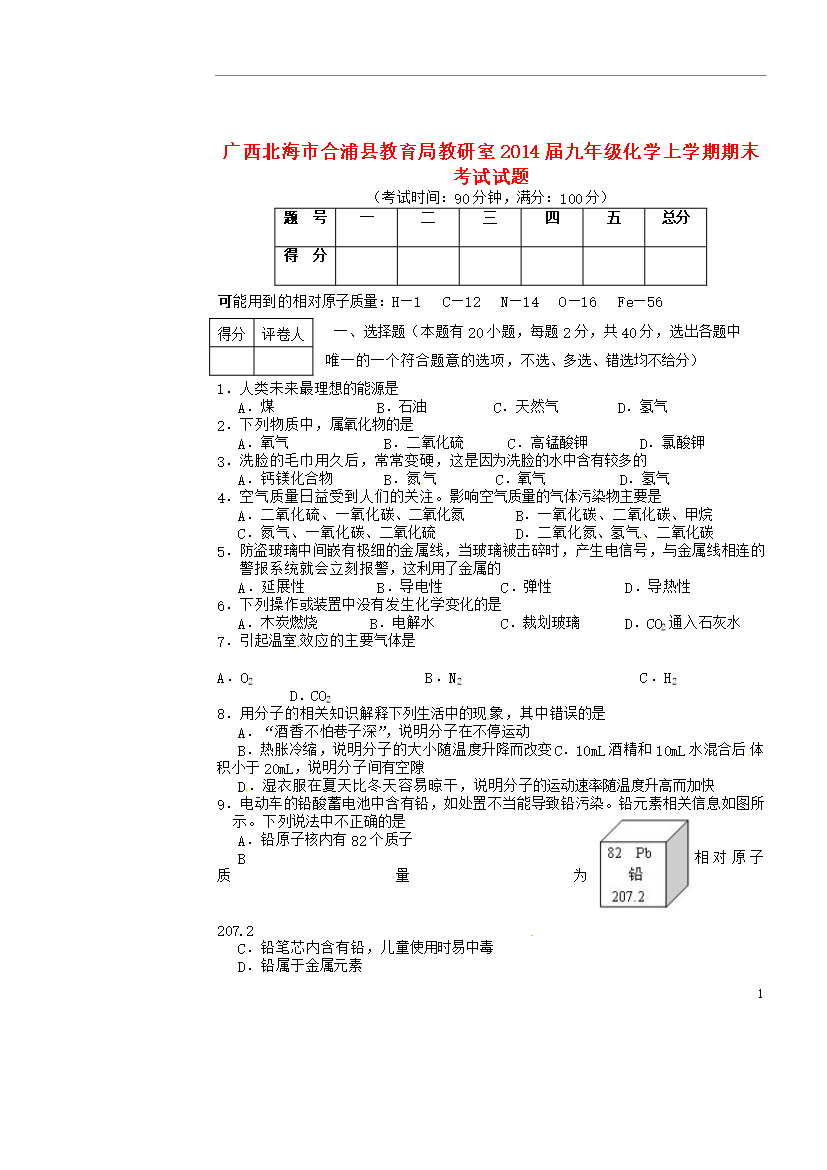 试题-广西-2014_广西北海市合浦县教育局教研室2014届九年级化学上学期期末考试试题