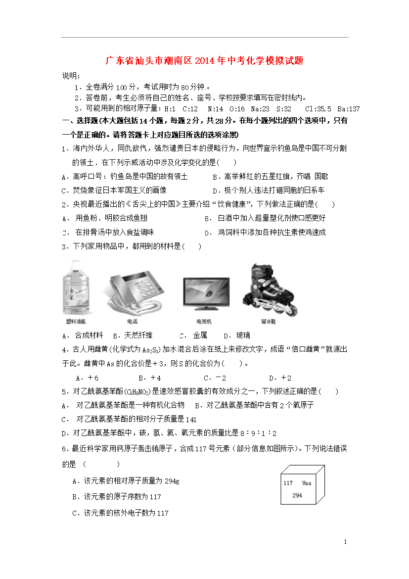 试题-广东-2014_广东省汕头市潮南区2014年中考化学模拟试题