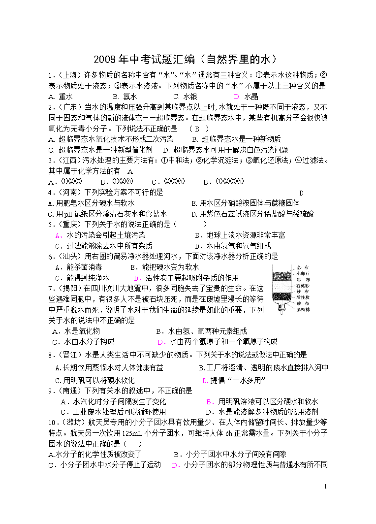 试题-全国-2008_2008年中考化学试题汇编(自然界里的水)