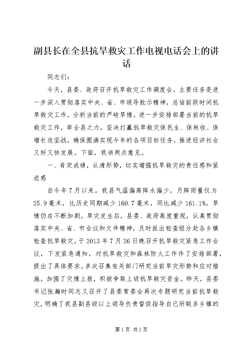 副县长在全县抗旱救灾工作电视电话会上的讲话