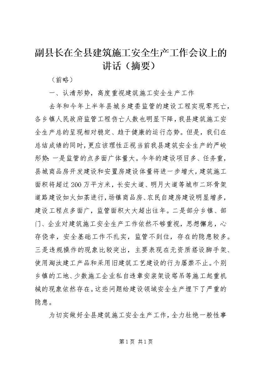 副县长在全县建筑施工安全生产工作会议上的讲话(摘要)_1