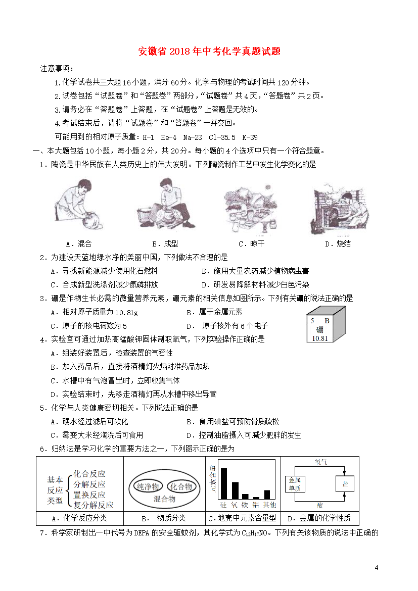试题-安徽-2018_安徽省2018年中考化学真题试题(含答案)