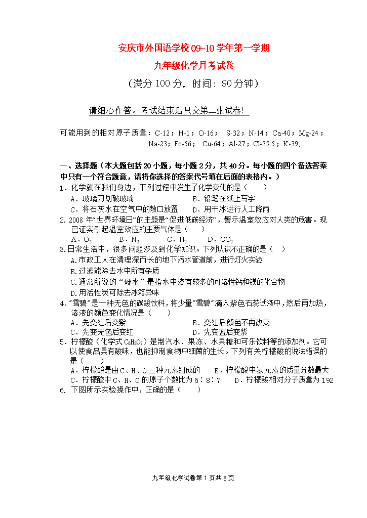 试题-安徽-2009_安徽省安庆市外国语学校09-10学年九年级化学化学第一学期月考试卷全国通用