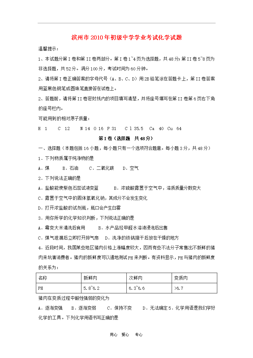 试题-山东-2010_山东省滨州市2010年中考真题化学试卷