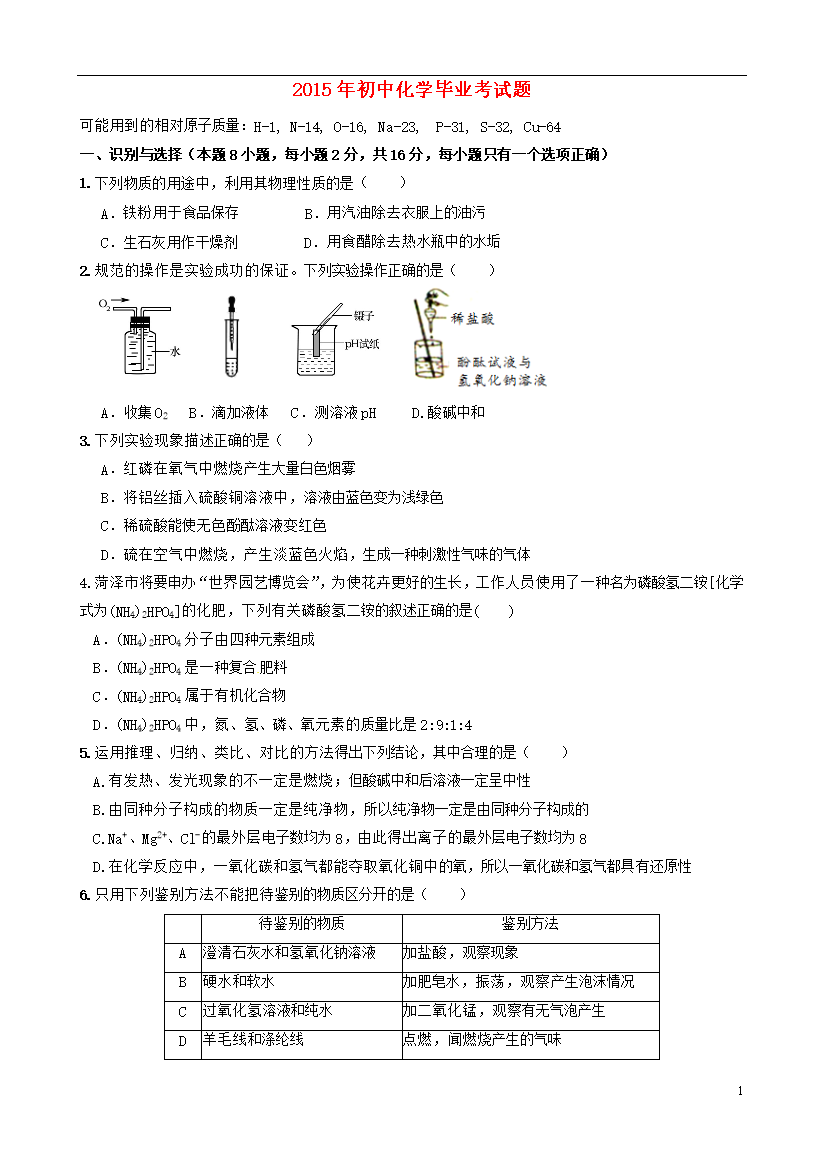 试题-山东-2015_山东省鄄城县彭楼乡彭楼中学2015届九年级化学毕业考试试题(无答案)