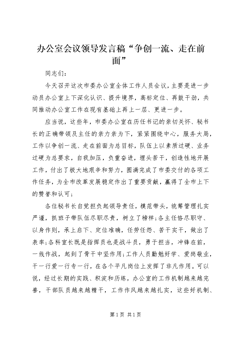 办公室会议领导发言稿“争创一流、走在前面”