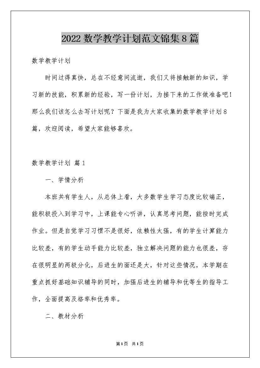 2022数学教学计划范文锦集8篇