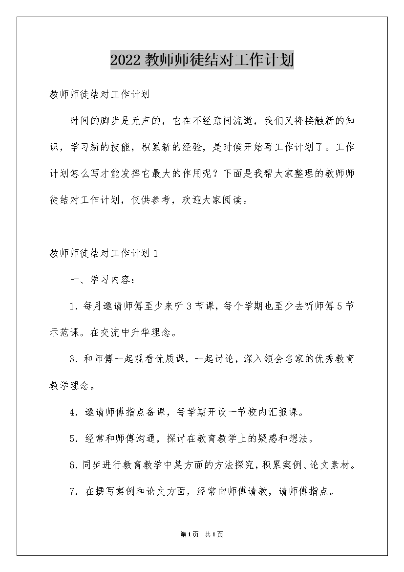 2022教师师徒结对工作计划