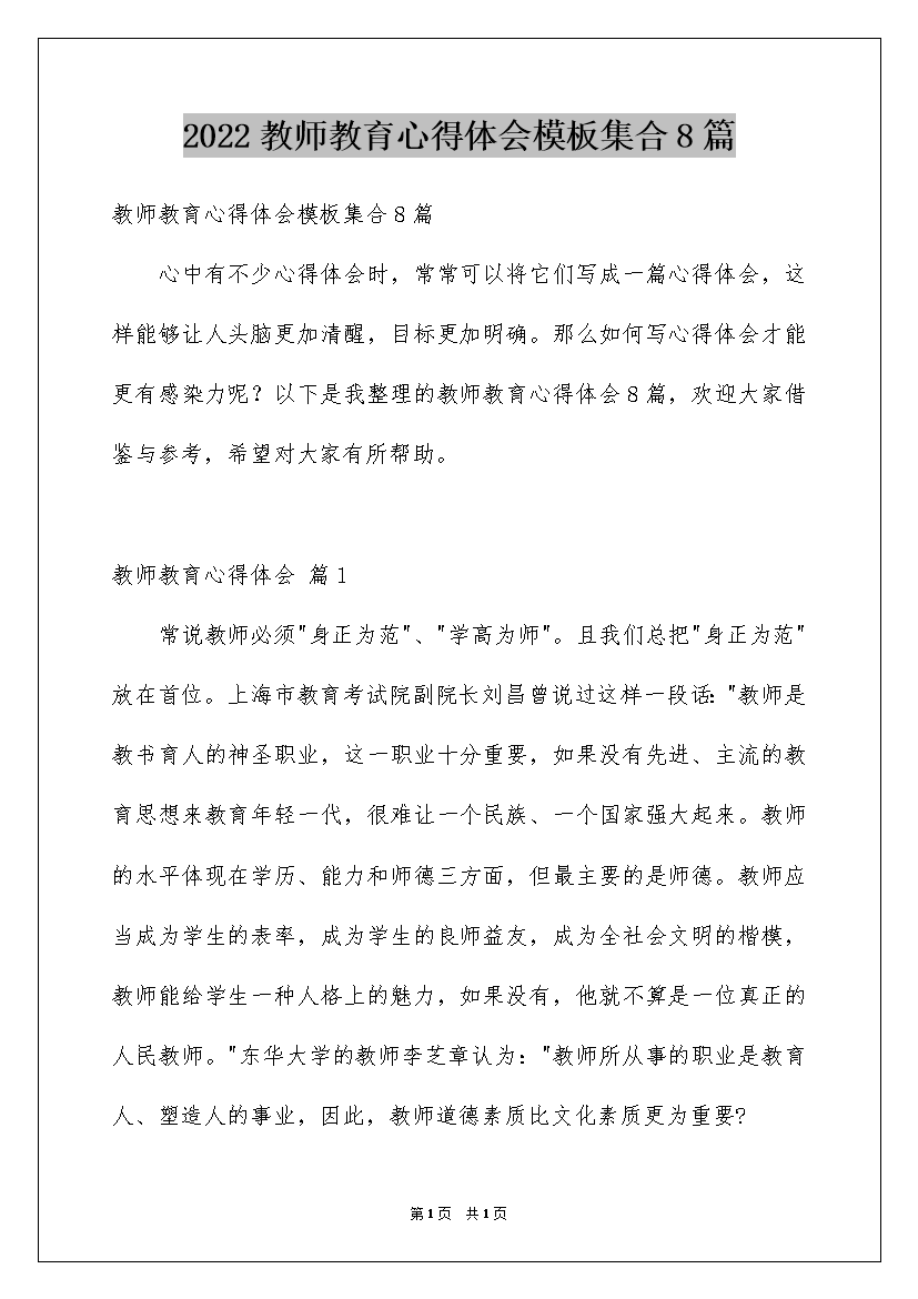 2022教师教育心得体会模板集合8篇