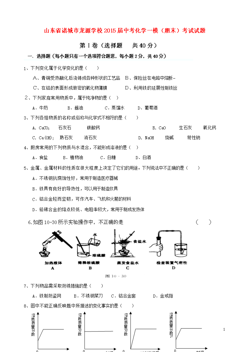 试题-山东-2015_山东省诸城市龙源学校2015届中考化学一模(期末)考试试题(无答案)