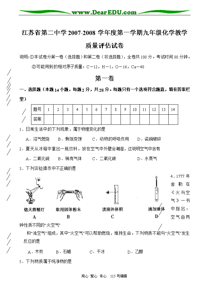 试题-江苏-2008_江苏省第二中学2007-2008学年度第一学期九年级化学教学质量评估试卷