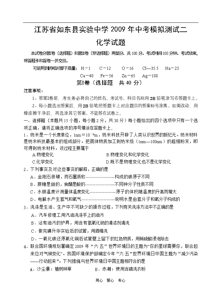 试题-江苏-2009_2009年江苏省如东县实验中学中考化学模拟测试二
