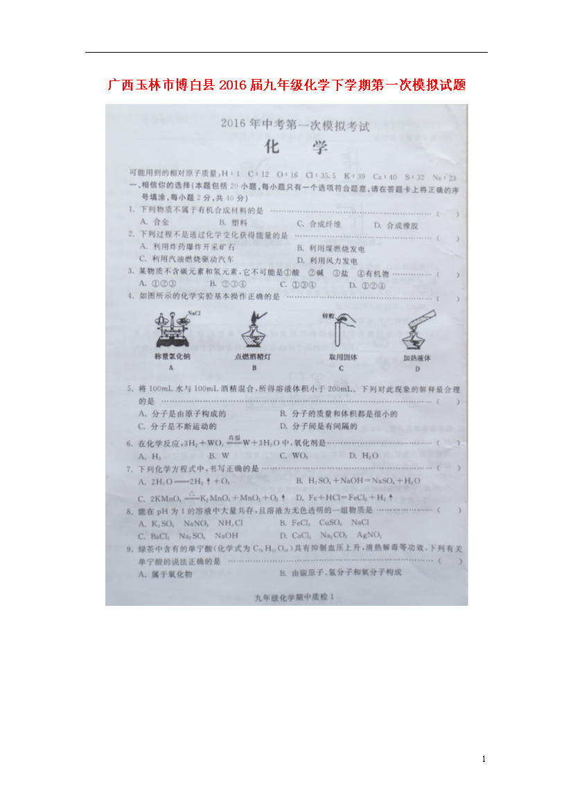 试题-广西-2016_广西玉林市博白县2016届九年级化学下学期第一次模拟试题(扫描版)