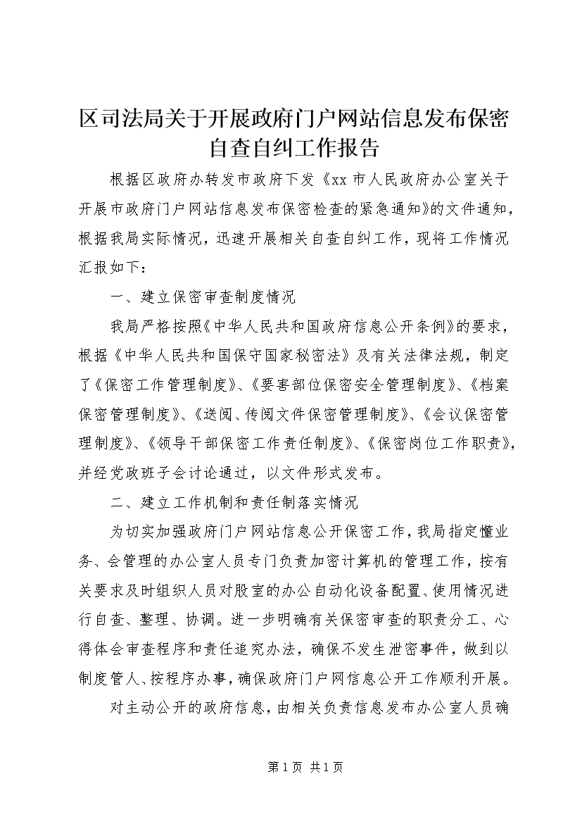 区司法局关于开展政府门户网站信息发布保密自查自纠工作报告