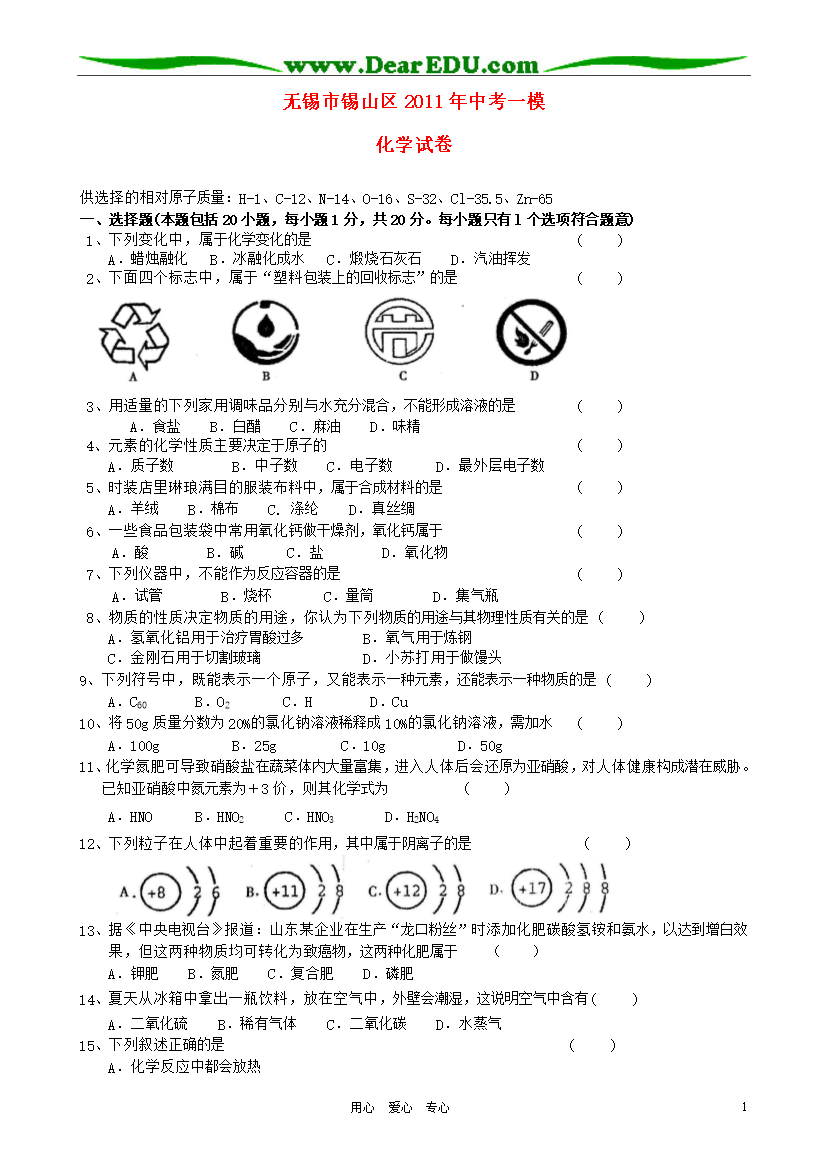 试题-江苏-2011_江苏省无锡市锡山区2011届中考化学一模试题