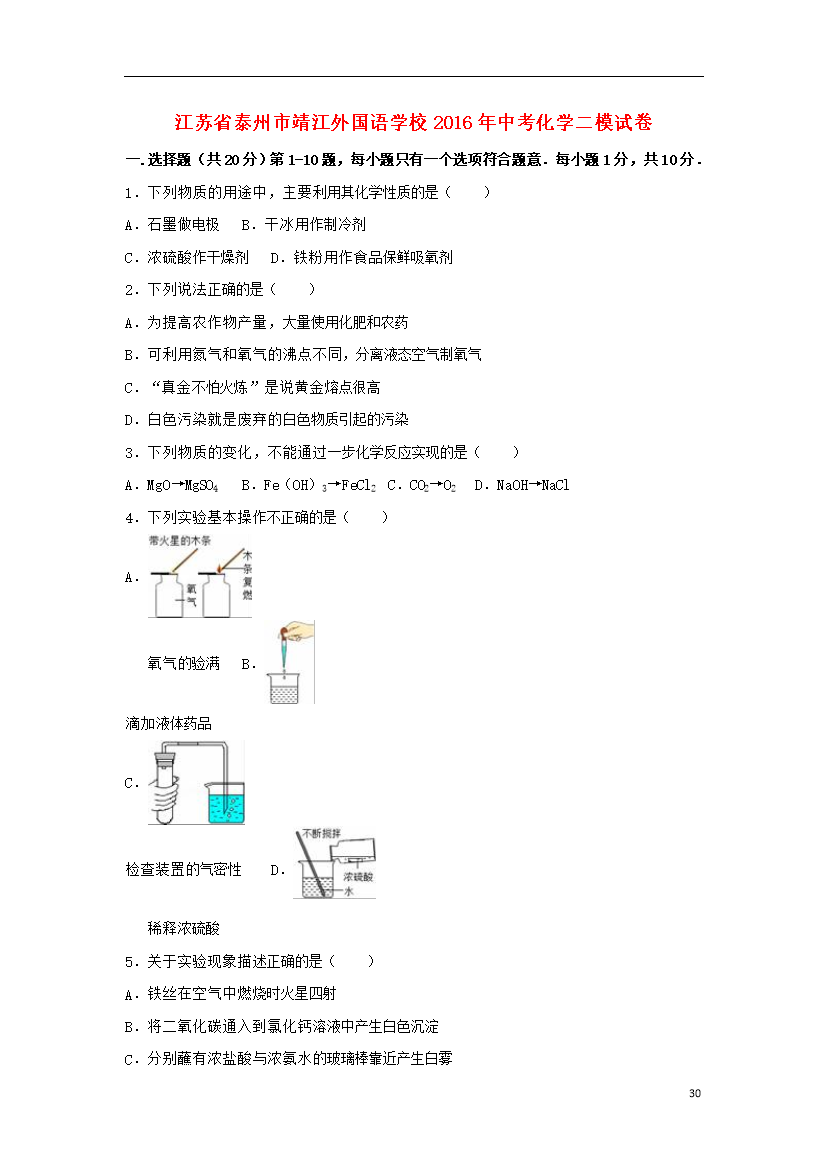 试题-江苏-2016_江苏省泰州市靖江外国语学校2016年中考化学二模试卷(含解析)