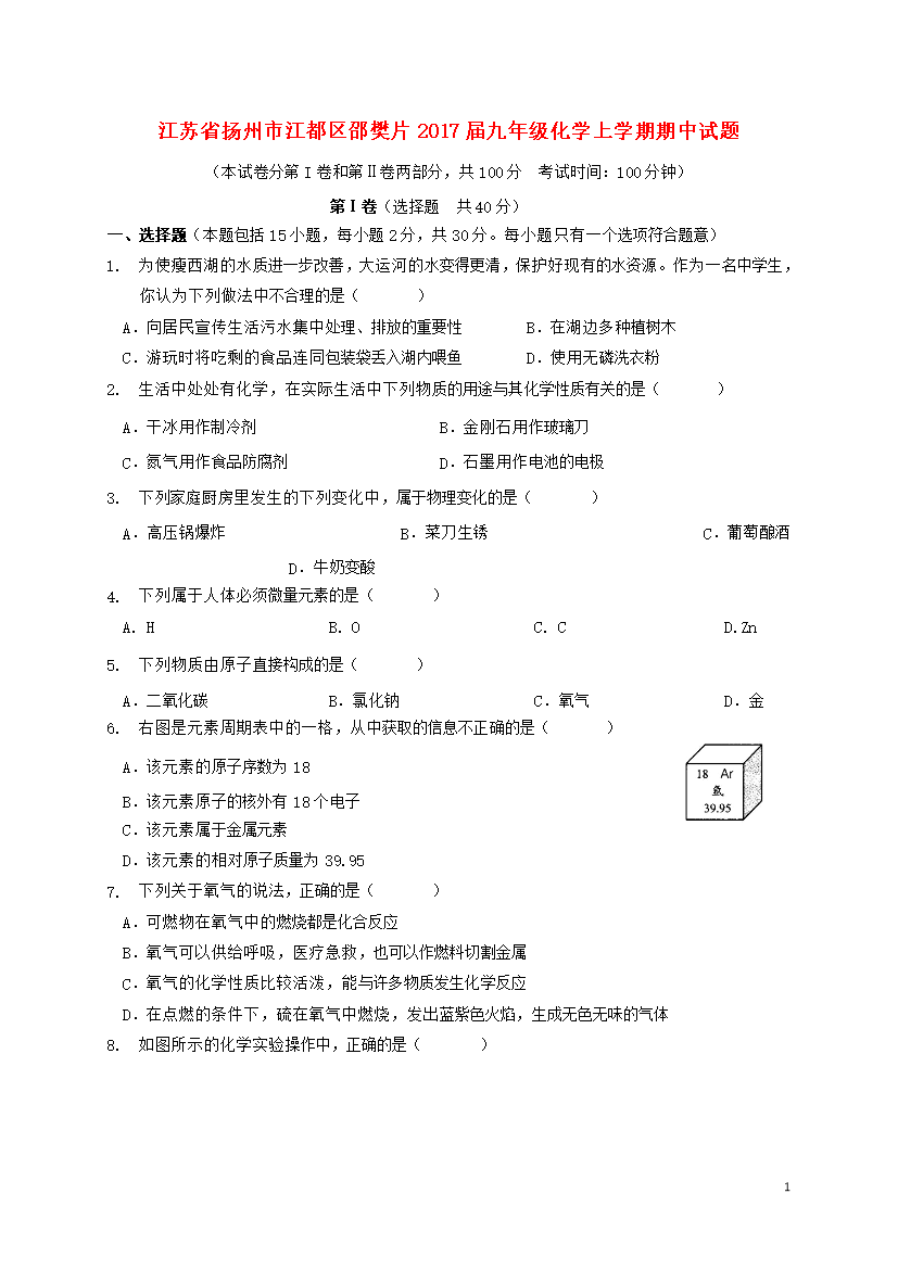 试题-江苏-2017_江苏省扬州市江都区邵樊片2017届九年级化学上学期期中试题