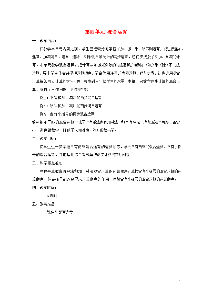 素材-全国-2019_2019年三年级数学下册 第四单元 混合运算教材分析 苏教版