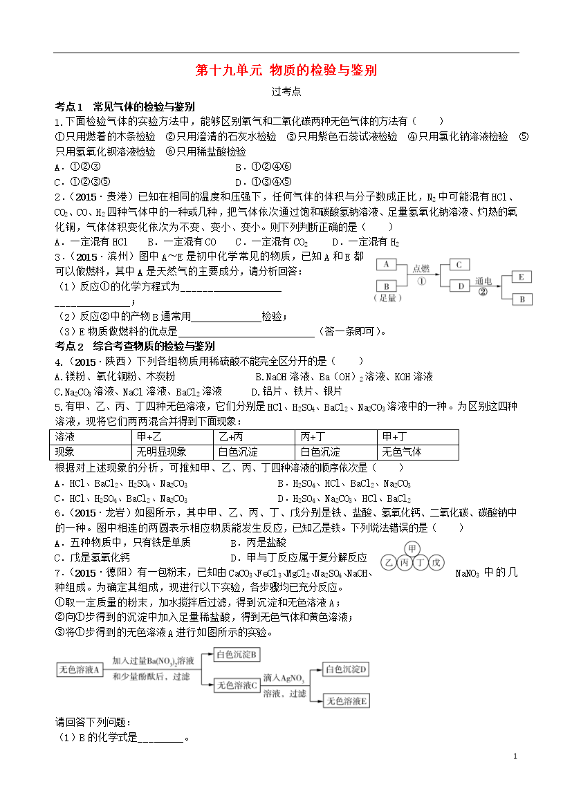 试题-全国-2016_领跑中考(广东专版)2016中考化学一轮复习 第十九单元 物质的检验与鉴别课时作业