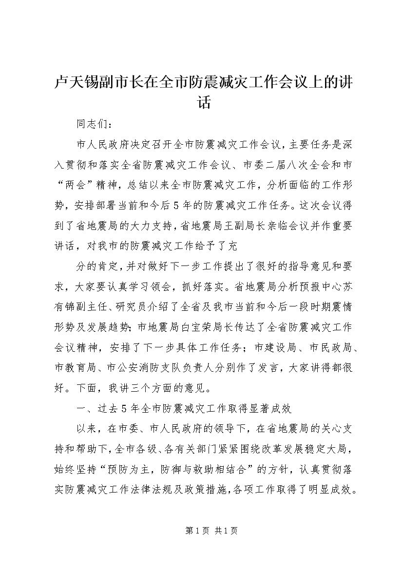 卢天锡副市长在全市防震减灾工作会议上的讲话 (2)