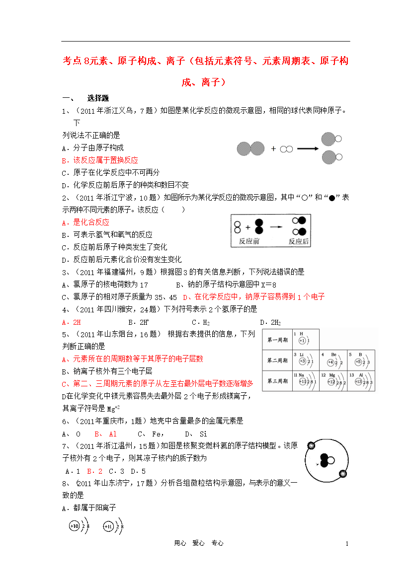 试题-全国-2011_(精华版2年中考按29个知识点+7大主题分类)2010-2011中考化学真题按知识点分类考点8 元素原子构成离子