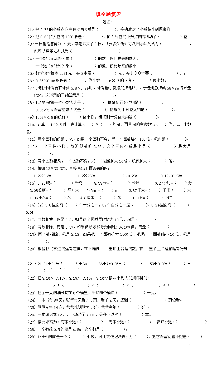 试题-全国-2019_2018学年五年级数学上册 专项练习 填空题复习(无答案) 新人教版