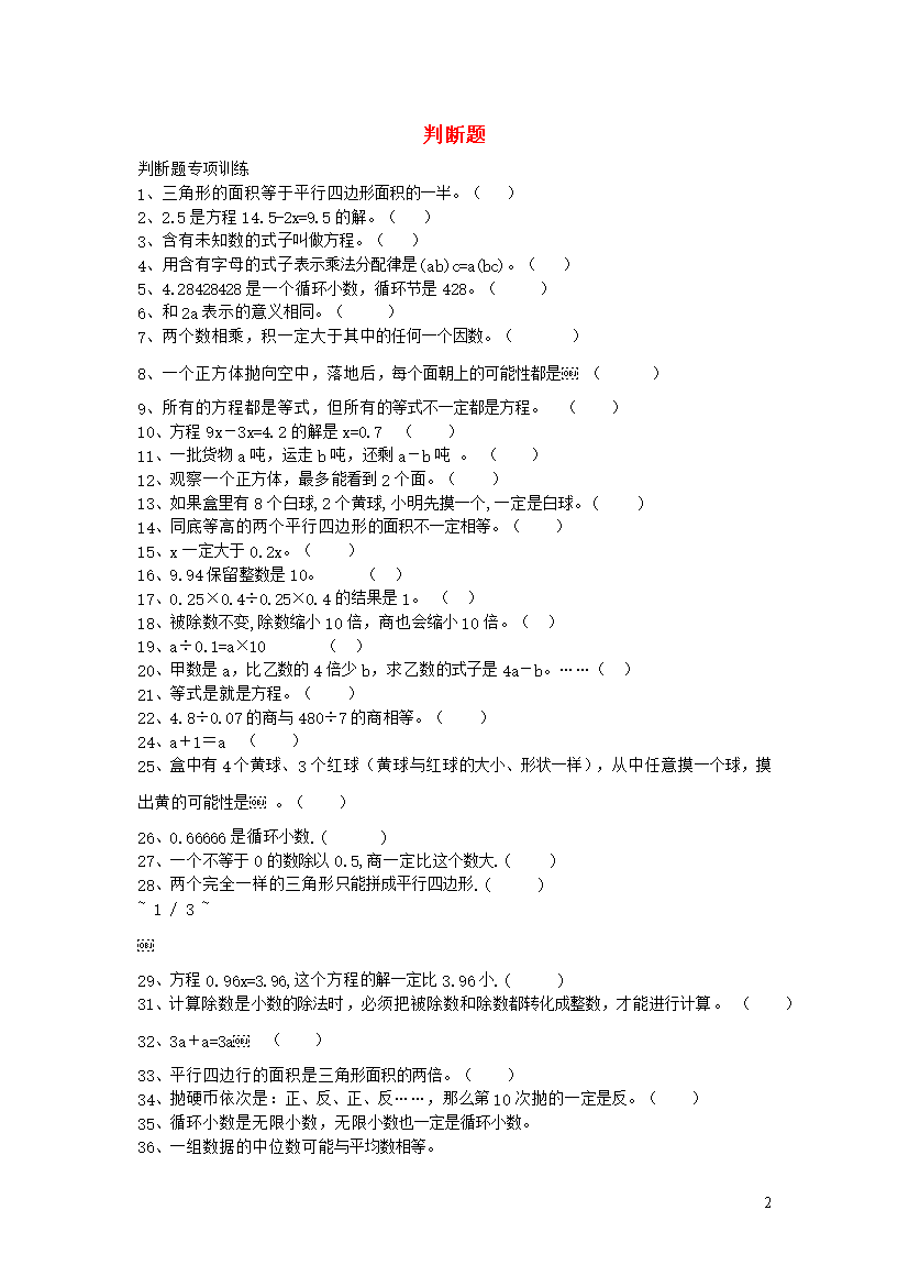 试题-全国-2019_2019年秋五年级数学上学期期末辅导资料(判断题)(无答案) 新人教版