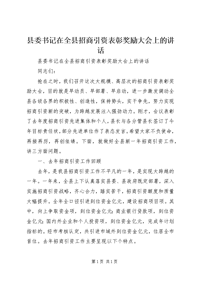 县委书记在全县招商引资表彰奖励大会上的讲话 (2)