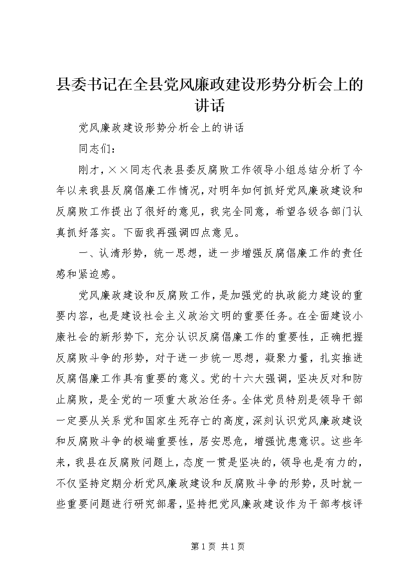 县委书记在全县党风廉政建设形势分析会上的讲话 (3)