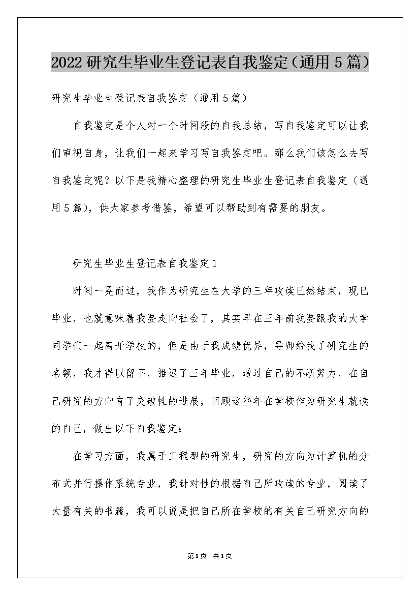 2022研究生毕业生登记表自我鉴定(通用5篇)