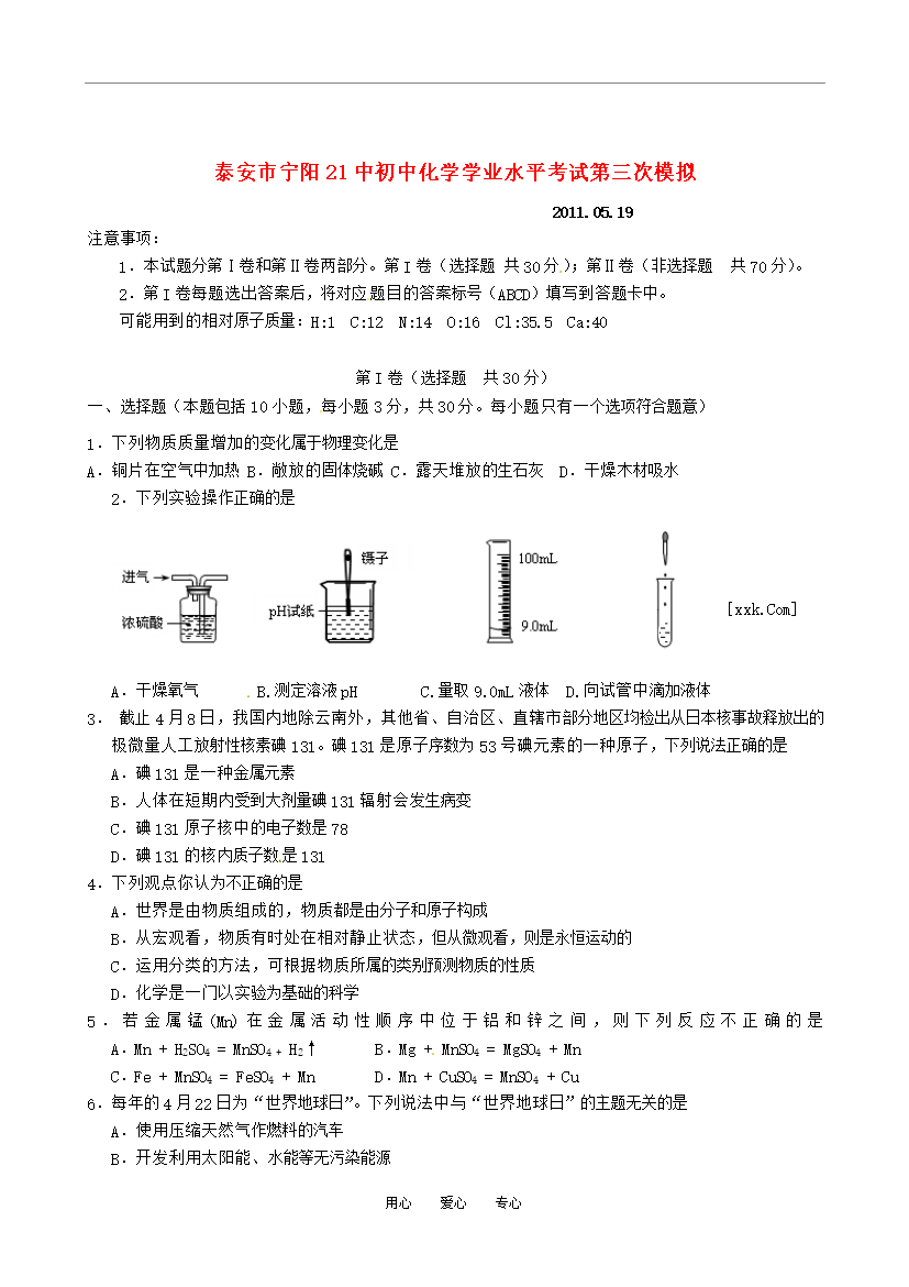 试题-山东-2011_山东省泰安市宁阳21中九年级化学学业水平考试题
