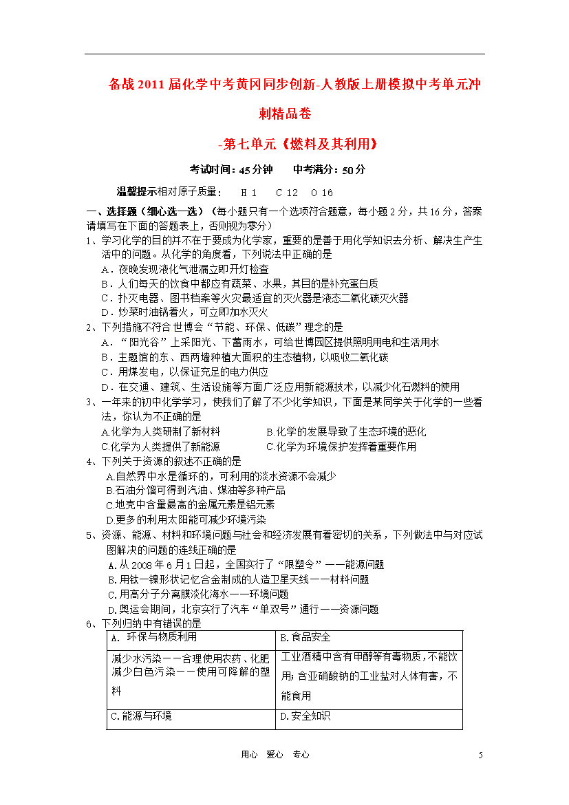 试题-全国-2011_黄冈一考通备战2011届中考化学模拟同步创新 第七单元《燃料及其利用》单元冲刺精品卷 人教新课标版