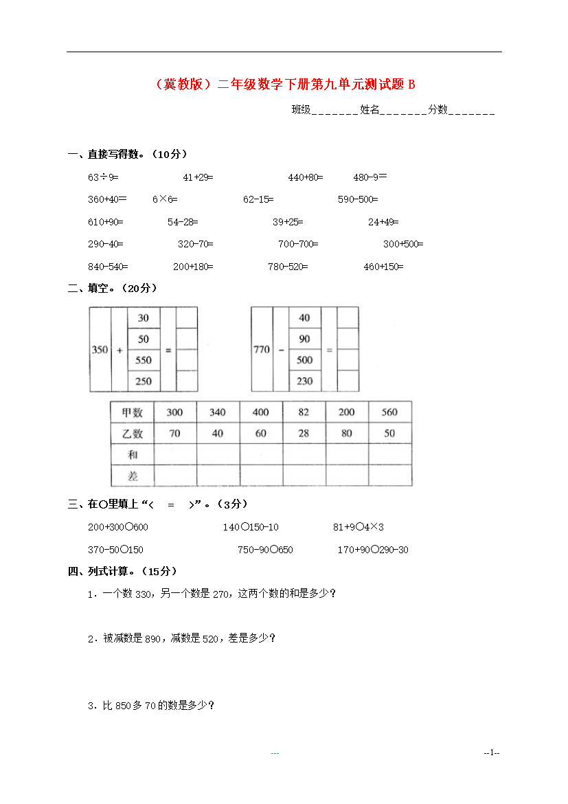 试题-全国-2011_二年级数学下册 第九单元测试题B 冀教版