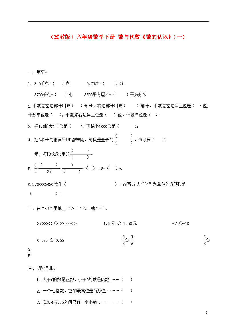 试题-全国-2012_六年级数学下册 数与代数《数的认识》(一)一课一练(无答案) 冀教版