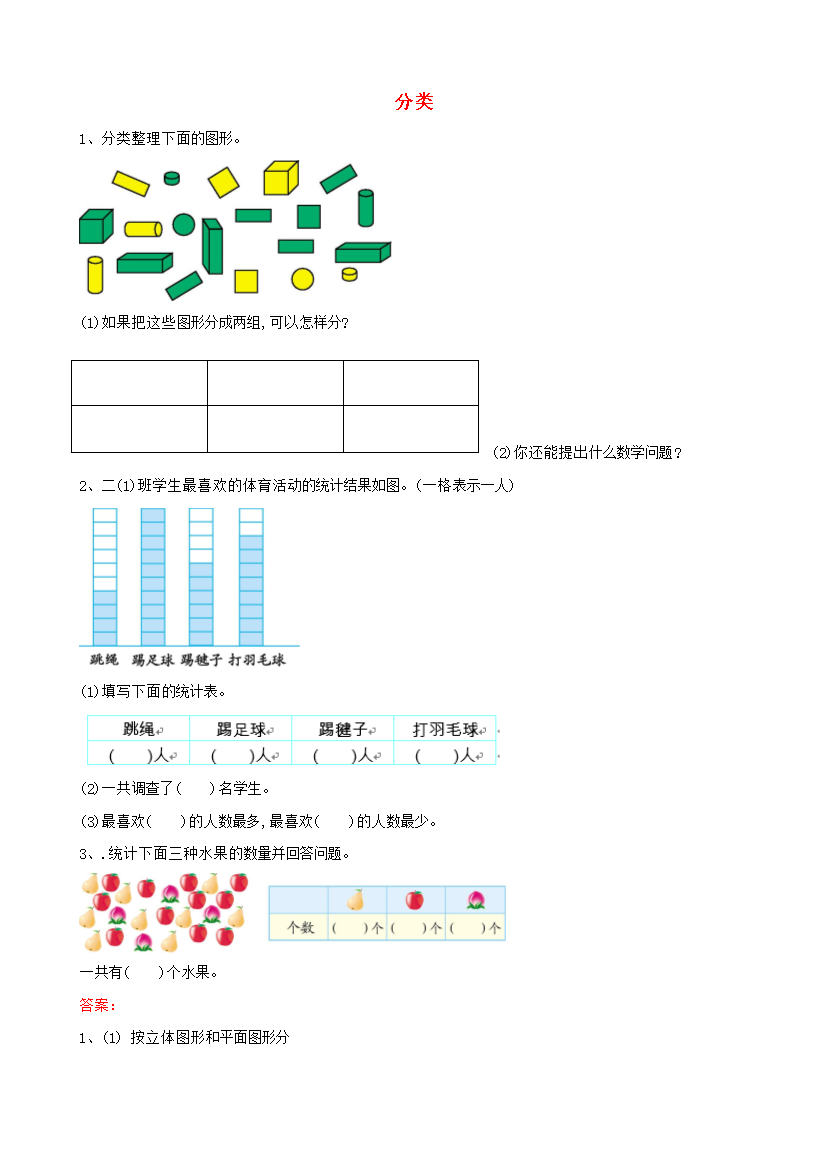 试题-全国-2020_一年级数学下册 第六单元 分类 6