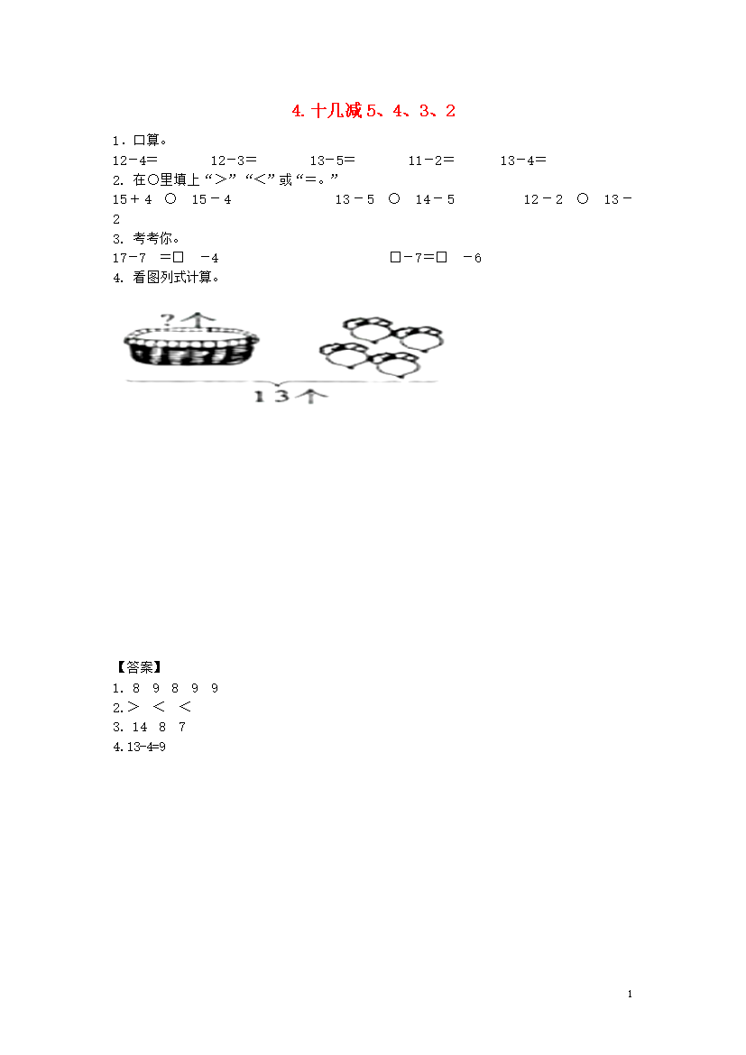 试题-全国-2019_一年级数学上册 九 加法和减法(二)9