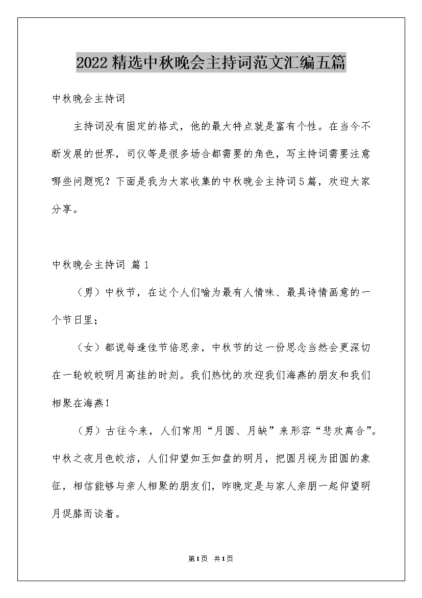 2022精选中秋晚会主持词范文汇编五篇